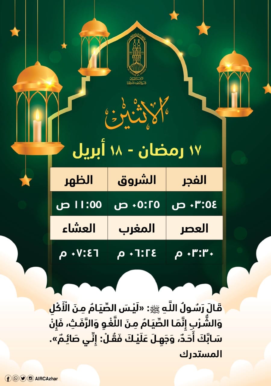 هذا موعد صلاتي المغرب والعشاء في اليوم السابع عشر من شهر رمضان بتوقيت القاهرة.. إني صائم .. أني صائم