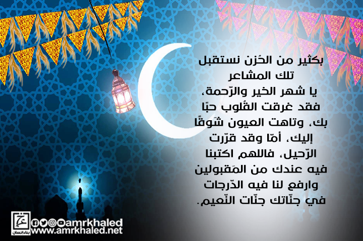 بكثير من الحُزن نستقبل تلك المشاعر يا شهر الخير والرّحمة، فقد غرقت القُلوب حبًا بك، وتاهت العيون شَوقًا إليك، أمّا وقد قرّرت الرّحيل، فاللهم اكتبنا فيه عندك من المَقبولين وارفع لنا فيه الدّرجات في جنّاتك جنّات النّعيم.