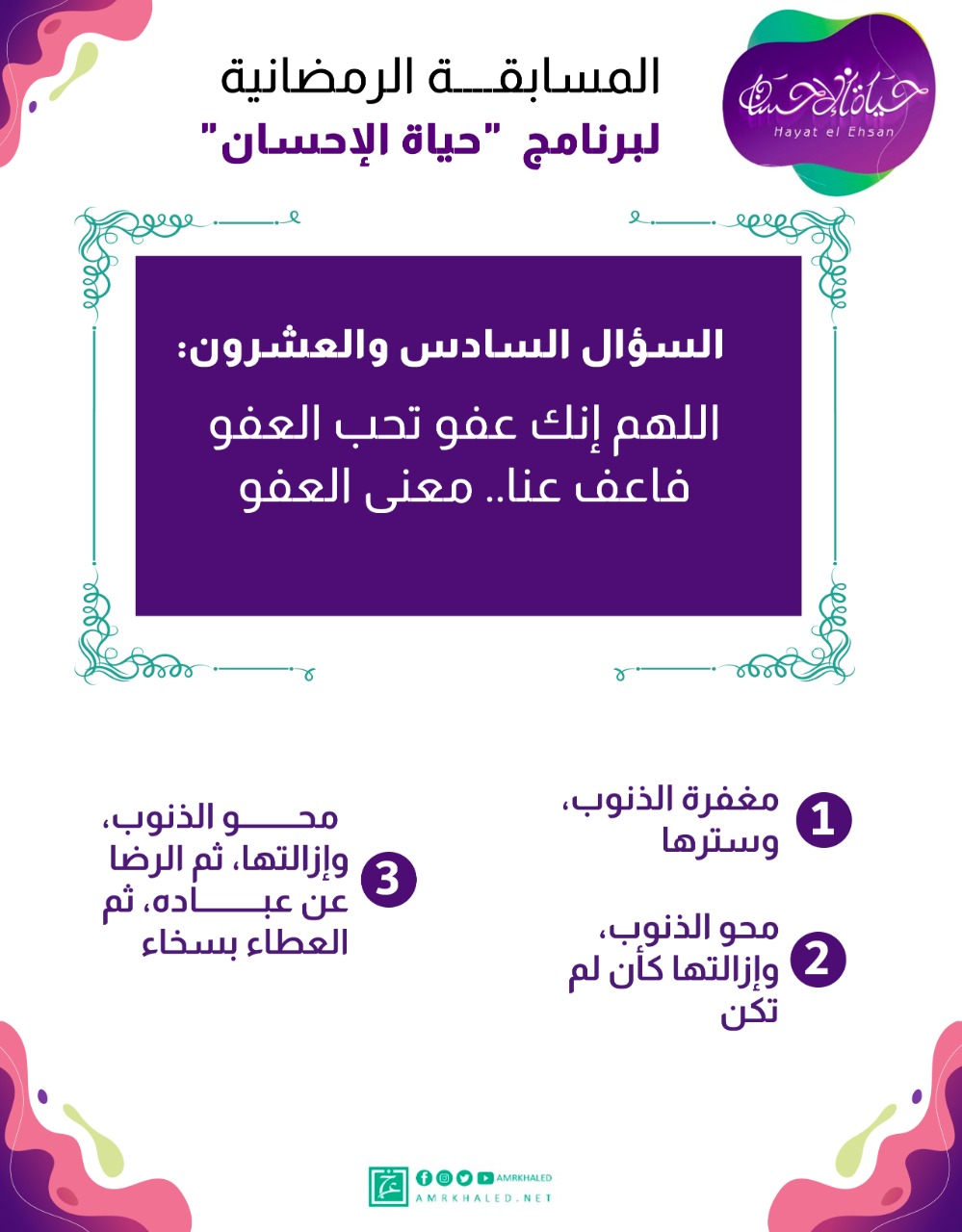 مسابقة برنامج "حياة الإحسان" للداعية الإسلامي الدكتور عمرو خالد رمضان 2022 متواصلة على مدار الشهر الكريم، ومكونة من 30 سؤالاً (كل يوم سؤال)، ومفتوحة لكل الأعمار والفئات.