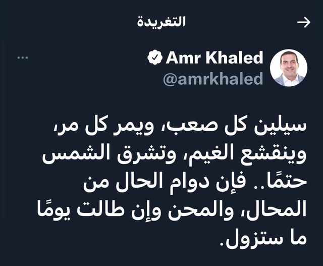 amrkhaled "سيلين كل صعب، ويمر كل مر، وينقشع الغيم، وتشرق الشمس حتمًا.. فإن دوام الحال من المحال، والمحن وإن طالت يومًا ما ستزول"