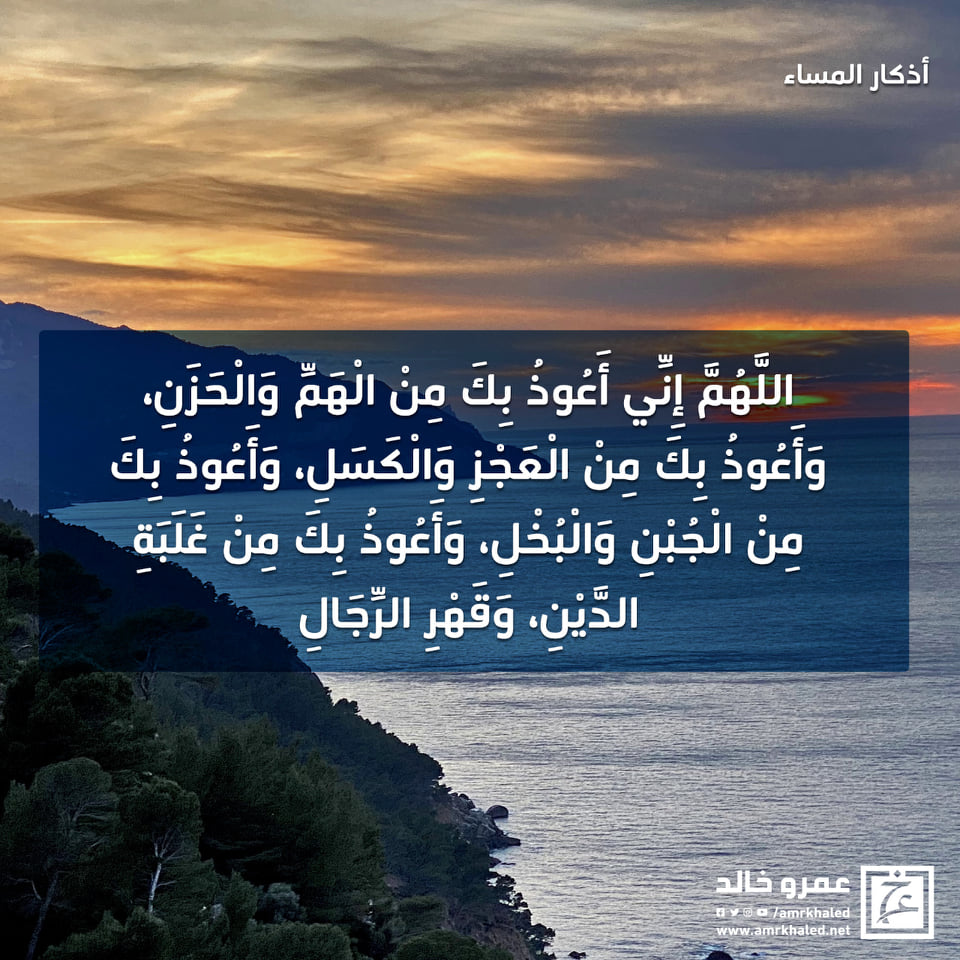 "اللهم إني أعوذ بك من الهم والحزن، وأعوذ بك من العجز والكسل، وأعوذ بك من الجبن والبخل، وغلبة الدين وقهر الرجال" .. من قالها حين يمسي فرج الله كربه وأزال همه