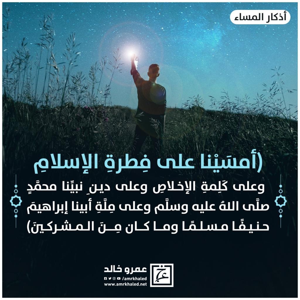 amrkhaled " أمسينا على فطرة الإسلام، وعلى كلمة الإخلاص، وعلى دين نبينا محمد صلى الله عليه وسلم، وعلى ملة ابينا إبراهيم حنيفا مسلما وما كان من المشركين"..من قاله