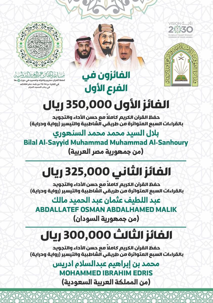 فاز الشاب المصري بلال السيد محمد السنهوري بالمركز الأول في الفرع الأول (القراءات) بمسابقة الملك عبدالعزيز لحفظ القُرآن الكريم وتلاوته وتفسيره في دورتها الثانية والأربعين، والبالغ قيمتها 350 ألف ريال سعودي.