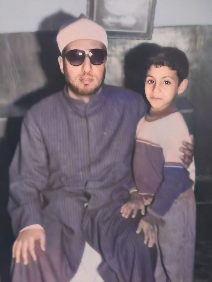 ويضيف نجل سلطان الابتهالات قائلًا: جدى توفي وكان والدى عمره صغيرًا وعدد أشقائه بمن فيهم هم كانوا ستة 6 منهم ثلاثة ذكور وثلاث إناث ، وكان ترتيب والدى الأول في إخوته الذكور، وعندما كف بصره دعت جدتى بأن يكون من حملة كتاب الله واستجاب الله لدعائها وحفظ والدى كتاب الله في سن مبكرة.