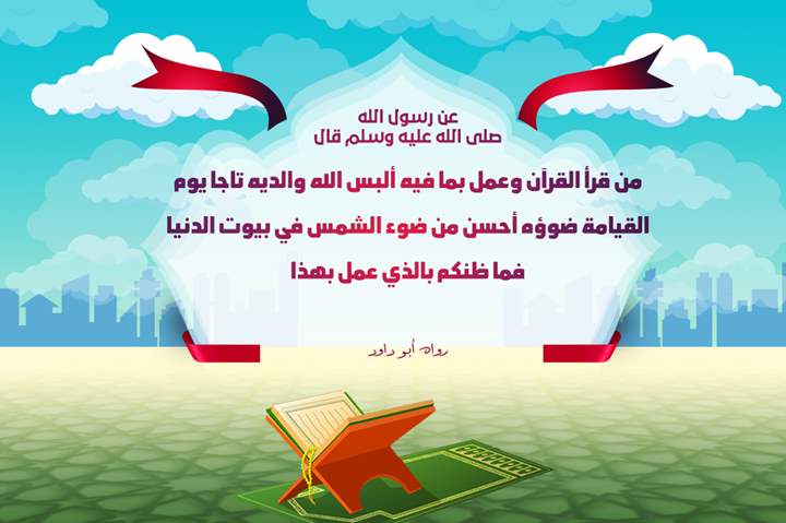 من قرأ القرآن وعمل بما فيه ألبس والده يوم القيامة تاجا ضوءه أحسن من ضوء الشمس