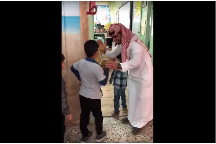 بالفيديو.. معلم يستقبل طلابه على باب الفصل بطريقة رائعة