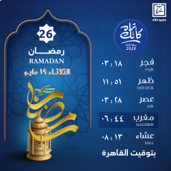 مواقيت الصلاة وموعد الإفطار ليوم الثلاثاء 26 رمضان (بتوقيت القاهرة)
