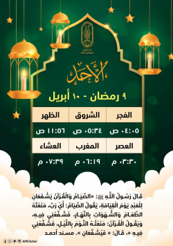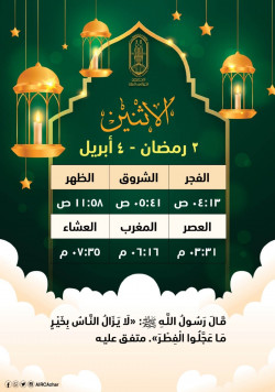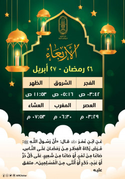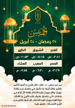 هذا موعد صلاتي المغرب والعشاء في اليوم السابع والعشرين من شهر رمضان بتوقيت القاهرة..كان رسول الله أجود بالخير من الريح المرسلة