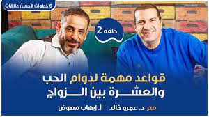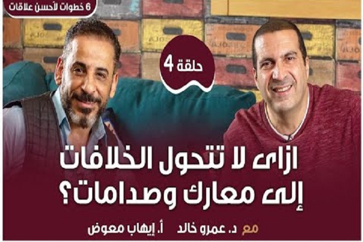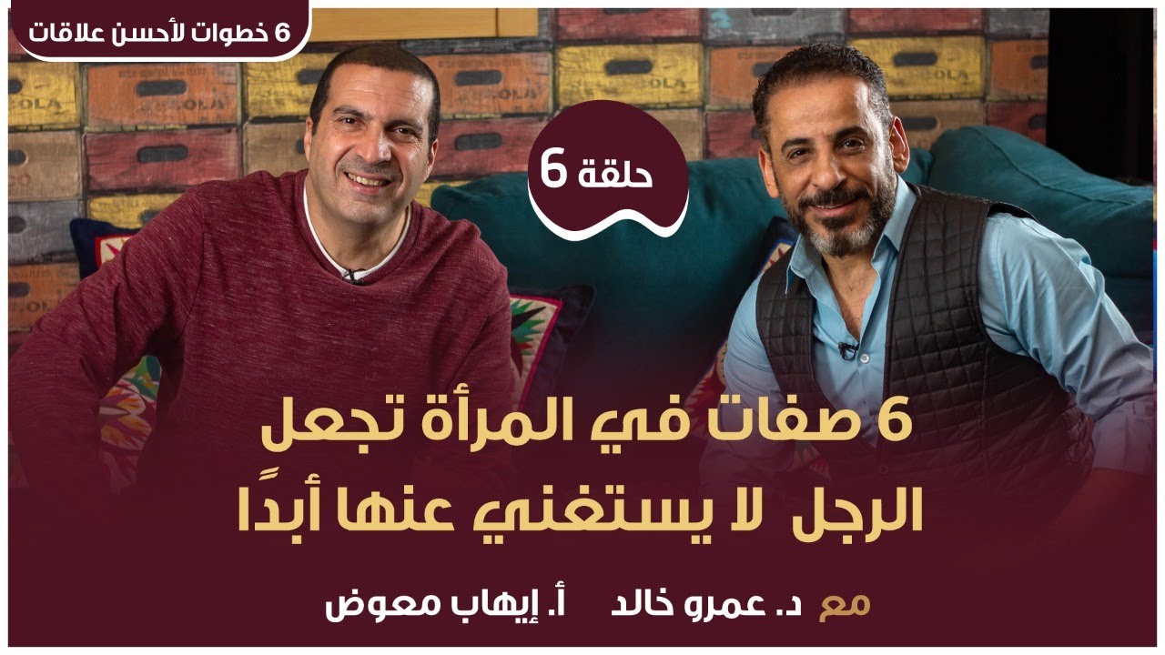 على مدار ستة أسابيع يلتقيكم الدكتور الداعية عمرو خالد مع إيهاب معوّض استشاري العلاقة الأسرية والزواجية من خلال برنامج أسبوعي جديد بعنوان "6 خطوات لأحسن علاقات"، وتدور فكرة البرنامج الجديد حول طرق تحسين كل أنواع العلاقات في الحياة، نظرًا لأهميتها، وخطورتها، على حياة الفرد والمجتمع، من أجل الوصول لدرجة "الإحسان" في العلاقات.